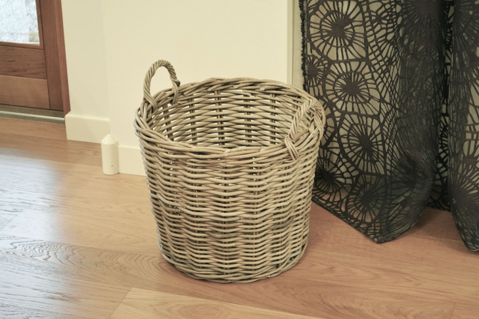 Cesta portaoggetti rotonda, dalla forma leggermente svasata. Intreccio a mano in rattan naturale Kubu grigio.
